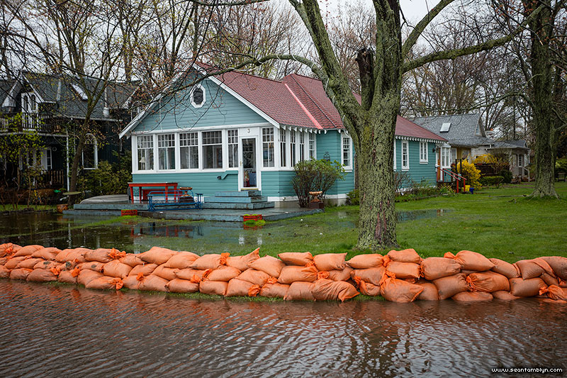 Sandbags line the road in front of 3 Seneca Ave. as the harbour waters continue to rise.