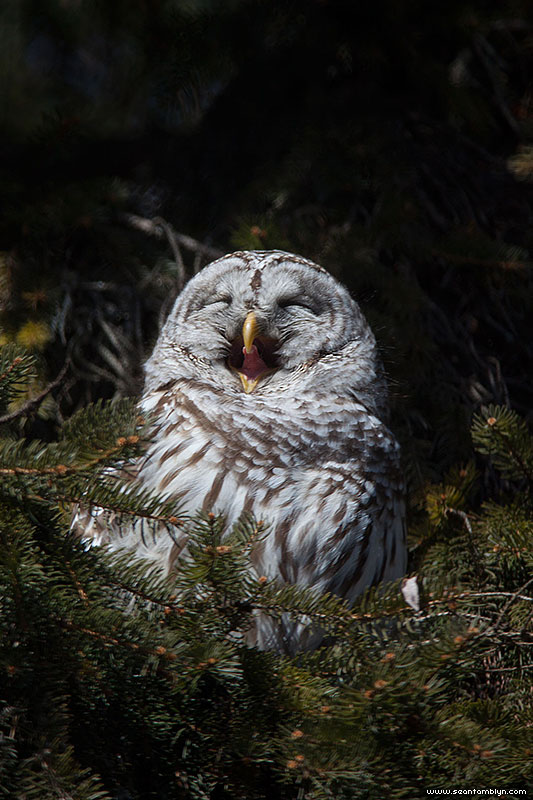 A barred owl interrupts a snooze in the sun to yawn loudly. Well, as loud as an owl ever is, which is virtually silent.