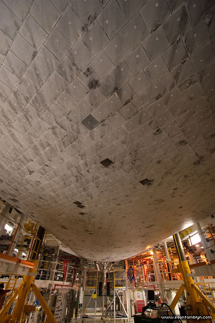 Waiting for launch of space shuttle Endeavour, a tour of the Orbiter Processing Facility takes the wideangle lens underneath space shuttle Discovery, her thermal protection tiles stretching off to the distant nose gear.