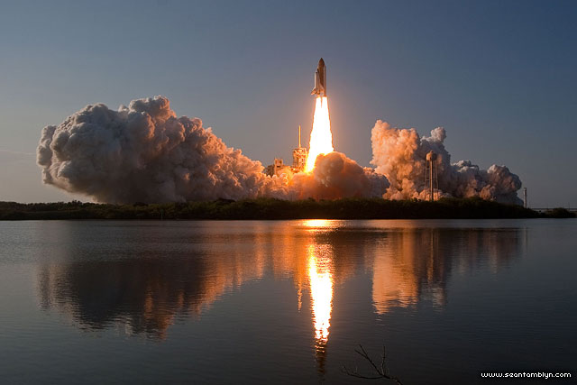 Space shuttle Discovery reaches for the sky on her final mission, consuming over 20,000lbs of propellant every second.
