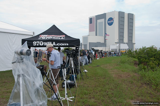 A wall of cameras line the shoreline of the press site at Kennedy Space Centre for the final launch of the space shuttle program.