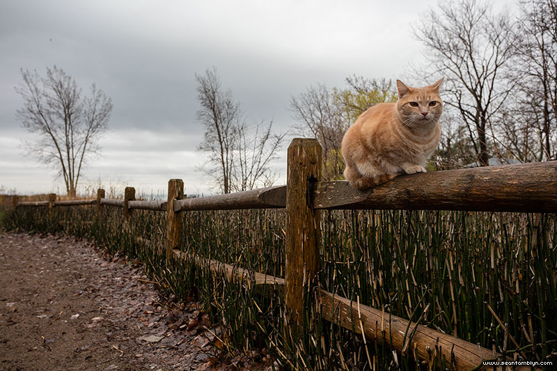 One of the ginger six-toed cats stays high and dry on the fence leading to Ward’s Beach.