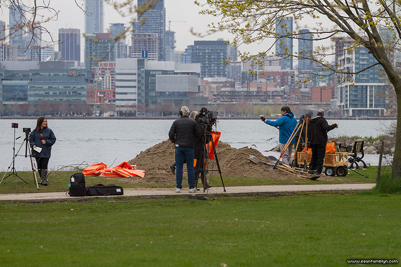 News crews cover the beginning of Bayview sandbag operations.