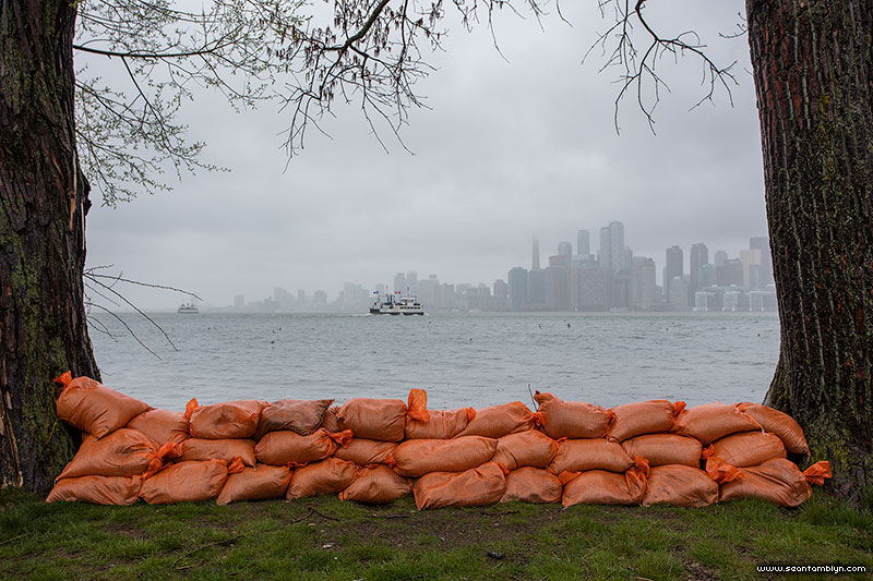 Ongiara sails past the sandbag dike on Bayview Ave.