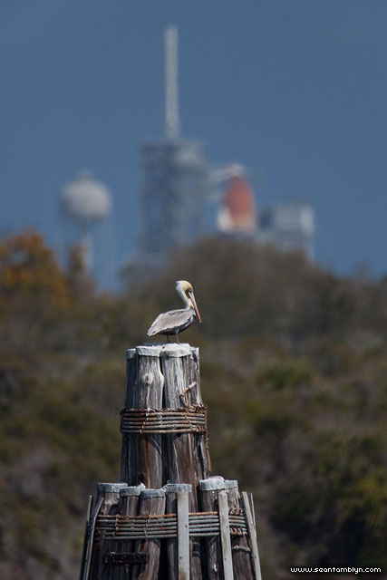 A brown pelican (previously misidentified as a stork) sits on a piling used to secure the barge that transports the shuttle’s External Tanks. The top of the STS-133 stack can be seen in the background.