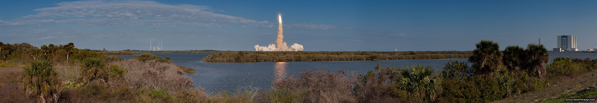 Space shuttle Discovery soars into the Florida skies, as seen in this 180° panorama taken from Astronaut Road. The massive Vehicle Assembly Building can be seen on the right, and Launch Complex 39B on the left.
