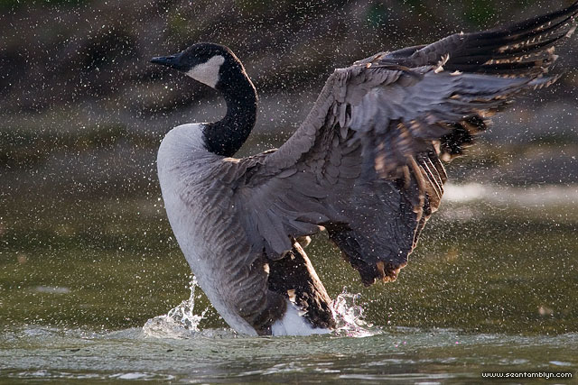 A Canada goose touches down in a rain of suspended water droplets, near the IYC on the inner harbour side of their island.
